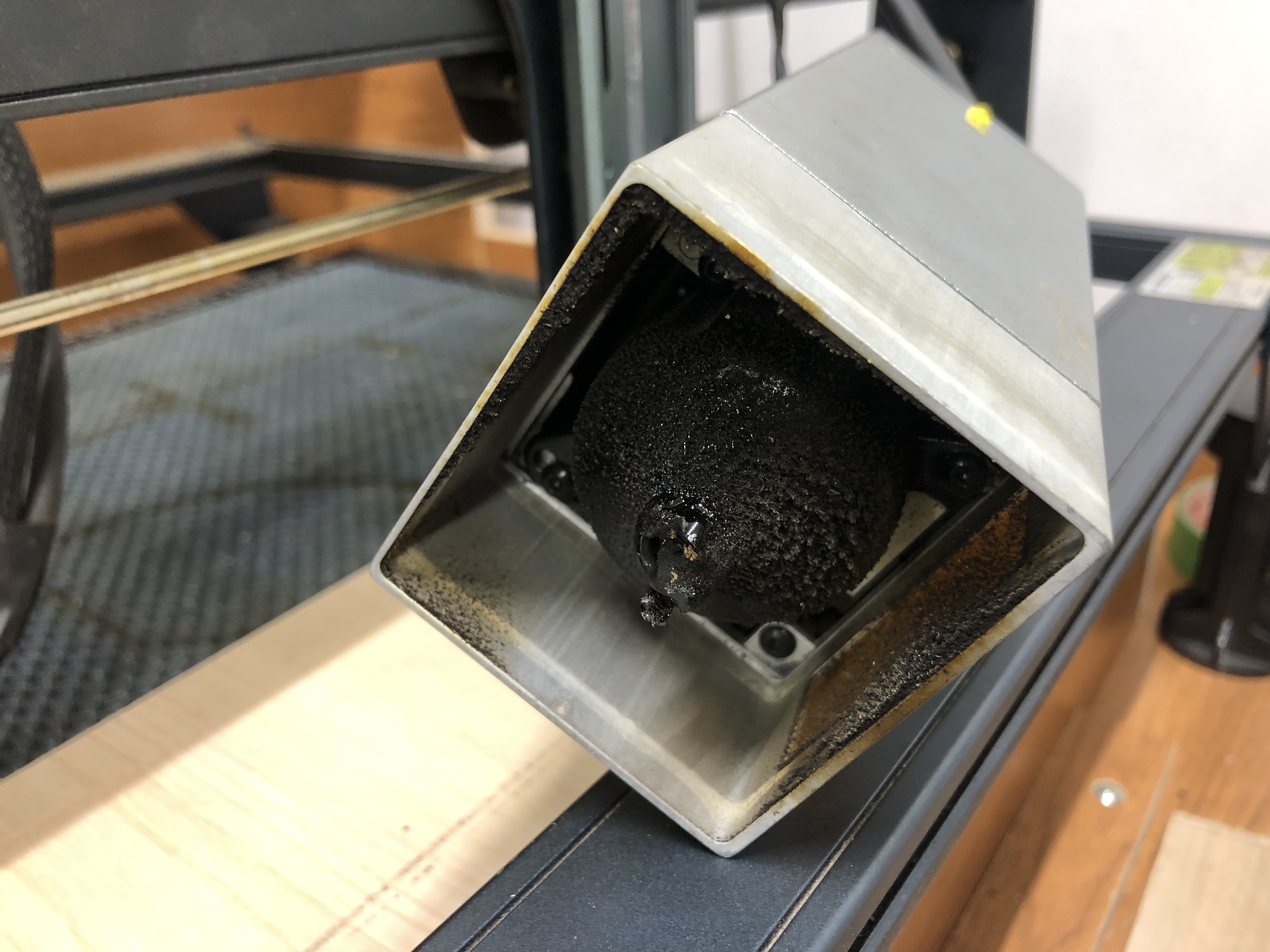 À force d'utiliser le graveur laser, la buse s'encrasse, il faut donc régulièrement s'assurer qu'il n'y a pas trop de saleté afin de pouvoir graver correctement. C'est lorsqu'on brule certaine matière ou alors lorsqu'on brule trop fort le bois que la suie, résine, vient se coller. Un bonne usage du graveur, on n'allant pas trop fort, en favorisant plusieurs passage plus doux, permettra d'avoir un graveur en meilleur état.
